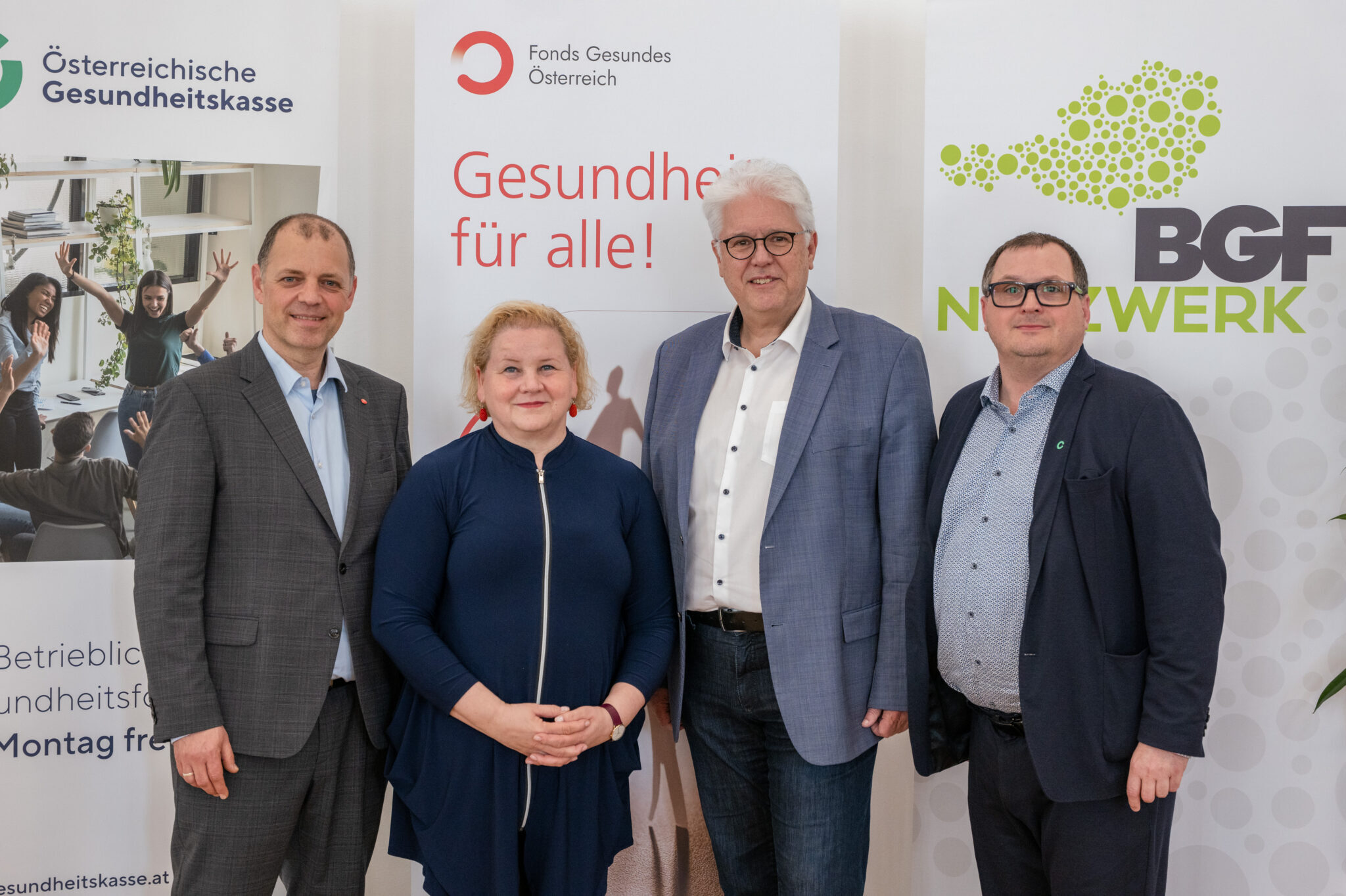 Auf dem Foto (v.l.n.r.): Vorsitzender des Fonds „Gesundes Österreich“ Gert Lang, OeSD-Gesundheitsbeauftragter Matthias Hohensasser, OeSD-Generaldirektor Helmut Lackner, Vorsitzender des Wiener ÖGK Landesstellenausschusses Walter Seemann.